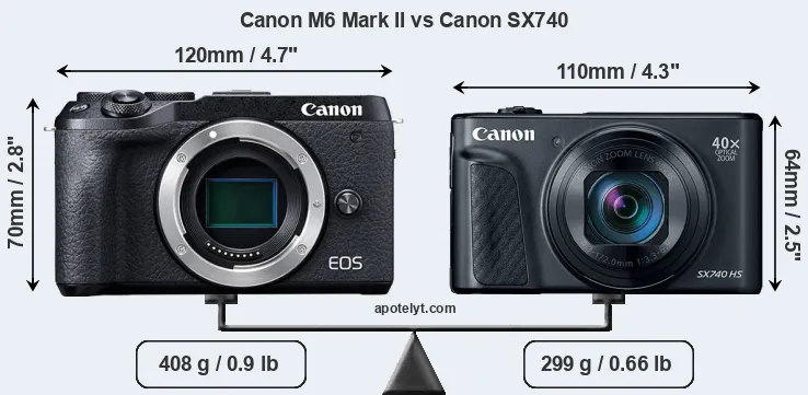 The physical size and weight of the Canon M6 Mark II and the Canon SX740 are illustrated in the side-by-side display below. The two cameras are presented according to their relative size. Three consecutive perspectives from the front, the top, and the back are available. All width, height and depth dimensions are rounded to the nearest millimeter.
