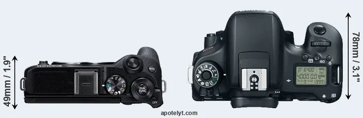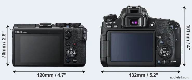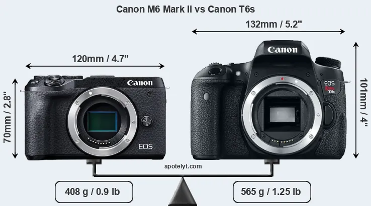 The physical size and weight of the Canon M6 Mark II and the Canon T6s are illustrated in the side-by-side display below. The two cameras are presented according to their relative size. Three consecutive perspectives from the front, the top, and the back are available. All width, height and depth measures are rounded to the nearest millimeter.