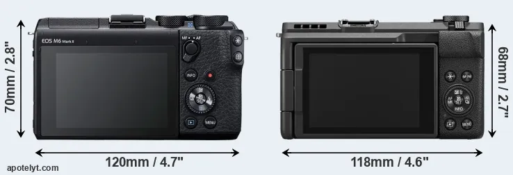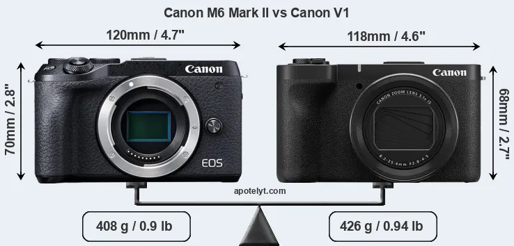 The physical size and weight of the Canon M6 Mark II and the Canon V1 are illustrated in the side-by-side display below. The two cameras are presented according to their relative size. Three consecutive perspectives from the front, the top, and the back are available. All width, height and depth measures are rounded to the nearest millimeter.