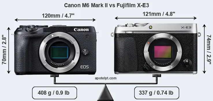 If the front view area (width x height) of the cameras is taken as an aggregate measure of their size, the Fujifilm X-E3 is notably larger (7 percent) than the Canon M6 Mark II. However, the X-E3 is markedly lighter (17 percent) than the M6 Mark II. In this context, it is worth noting that neither the M6 Mark II nor the X-E3 are weather-sealed.