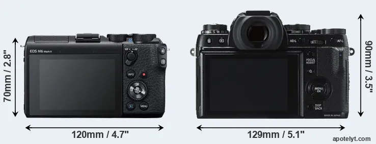 The side-by-side display below illustrates the physical size and weight of the Canon M6 Mark II and the Fujifilm X-T1. The two cameras are presented according to their relative size. Three consecutive perspectives from the front, the top, and the back are available. All width, height and depth measures are rounded to the nearest millimeter.