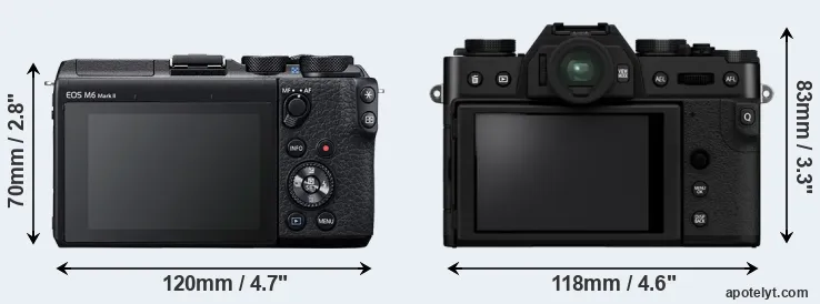 If the front view area (width x height) of the cameras is taken as an aggregate measure of their size, the Fujifilm X-T30 II is notably larger (17 percent) than the Canon M6 Mark II. However, the X-T30 II is markedly lighter (6 percent) than the M6 Mark II. In this context, it is worth noting that neither the M6 Mark II nor the X-T30 II are weather-sealed.