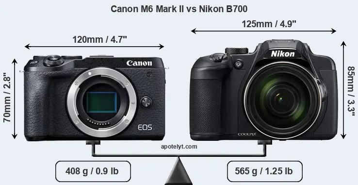 The physical size and weight of the Canon M6 Mark II and the Nikon B700 are illustrated in the side-by-side display below. The two cameras are presented according to their relative size. Three successive views from the front, the top, and the rear are shown. All width, height and depth measures are rounded to the nearest millimeter.