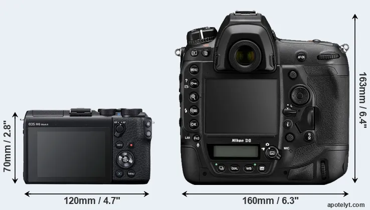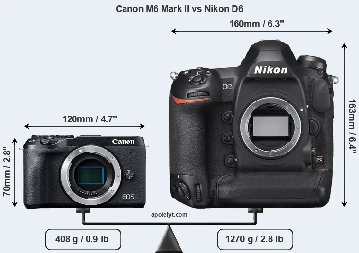 The side-by-side display below illustrates the physical size and weight of the Canon M6 Mark II and the Nikon D6. The two cameras are presented according to their relative size. Three consecutive perspectives from the front, the top, and the back are available. All width, height and depth measures are rounded to the nearest millimeter.