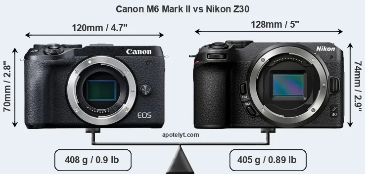 An illustration of the physical size and weight of the Canon M6 Mark II and the Nikon Z30 is provided in the side-by-side display below. The two cameras are presented according to their relative size. Three successive views from the front, the top, and the rear are shown. All width, height and depth dimensions are rounded to the nearest millimeter.