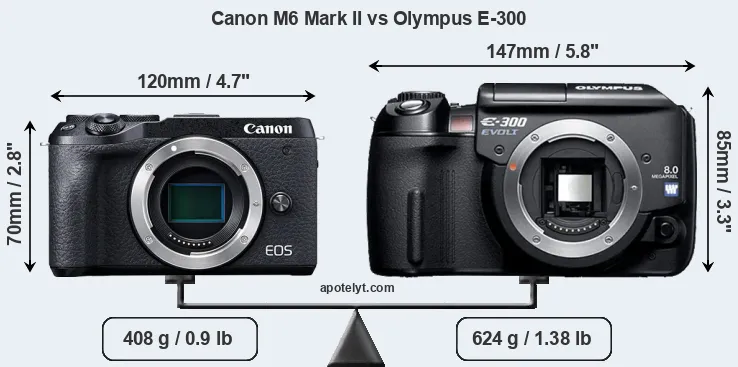 If the front view area (width x height) of the cameras is taken as an aggregate measure of their size, the Olympus E-300 is considerably larger (49 percent) than the Canon M6 Mark II. Moreover, the E-300 is substantially heavier (53 percent) than the M6 Mark II. In this context, it is worth noting that neither the M6 Mark II nor the E-300 are weather-sealed.
