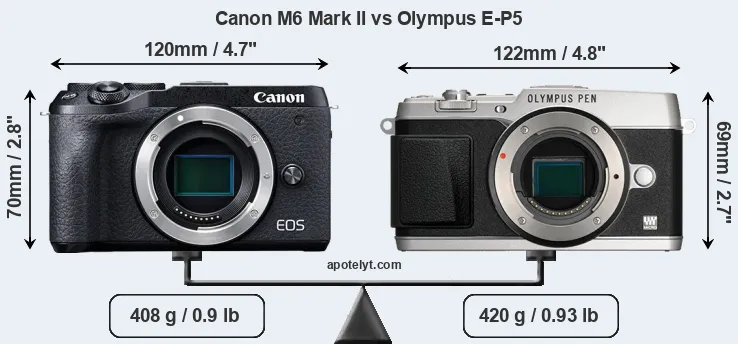 An illustration of the physical size and weight of the Canon M6 Mark II and the Olympus E-P5 is provided in the side-by-side display below. The two cameras are presented according to their relative size. Three consecutive perspectives from the front, the top, and the back are available. All width, height and depth dimensions are rounded to the nearest millimeter.