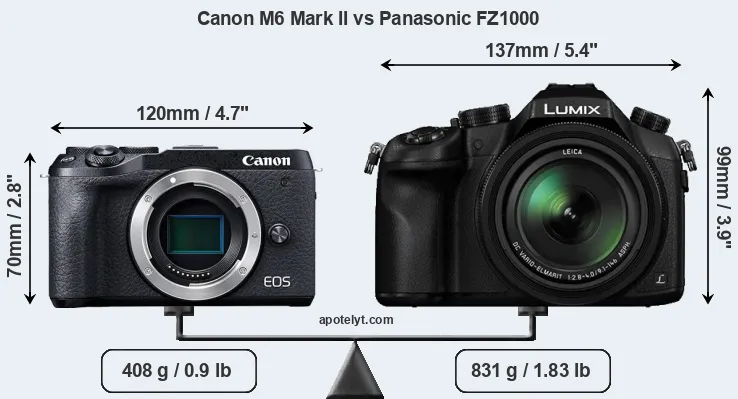 An illustration of the physical size and weight of the Canon M6 Mark II and the Panasonic FZ1000 is provided in the side-by-side display below. The two cameras are presented according to their relative size. Three successive views from the front, the top, and the rear are shown. All width, height and depth dimensions are rounded to the nearest millimeter.
