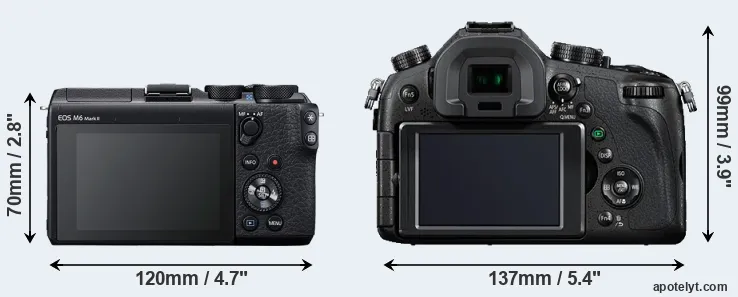 Going beyond this snapshot of core features and characteristics, what are the differences between the Canon EOS M6 Mark II and the Panasonic Lumix DMC-FZ1000? Which one should you buy? Read on to find out how these two cameras compare with respect to their body size, their imaging sensors, their shooting features, their input-output connections, and their reception by expert reviewers.