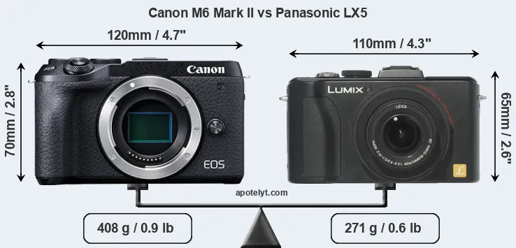 The side-by-side display below illustrates the physical size and weight of the Canon M6 Mark II and the Panasonic LX5. The two cameras are presented according to their relative size. Three consecutive views from the front, the top, and the rear side are shown. All width, height and depth measures are rounded to the nearest millimeter.