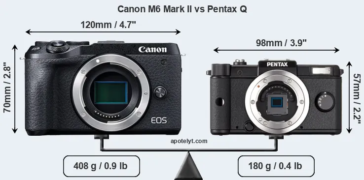 The physical size and weight of the Canon M6 Mark II and the Pentax Q are illustrated in the side-by-side display below. The two cameras are presented according to their relative size. Three successive views from the front, the top, and the rear are shown. All width, height and depth measures are rounded to the nearest millimeter.