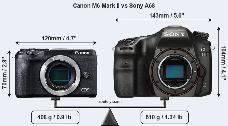 The side-by-side display below illustrates the physical size and weight of the Canon M6 Mark II and the Sony A68. The two cameras are presented according to their relative size. Three consecutive views from the front, the top, and the rear side are shown. All width, height and depth dimensions are rounded to the nearest millimeter.