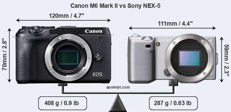 If the front view area (width x height) of the cameras is taken as an aggregate measure of their size, the Sony NEX-5 is notably smaller (22 percent) than the Canon M6 Mark II. Moreover, the NEX-5 is markedly lighter (30 percent) than the M6 Mark II. In this context, it is worth noting that neither the M6 Mark II nor the NEX-5 are weather-sealed.