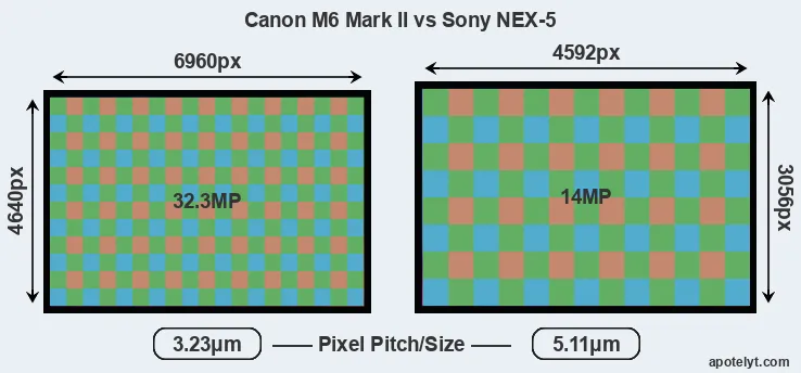 Despite having a smaller sensor, the Canon M6 Mark II offers a higher resolution of 32.3 megapixels, compared with 14 MP of the Sony NEX-5. This megapixels advantage comes at the cost of a higher pixel density and a smaller size of the individual pixel (with a pixel pitch of 3.23μm versus 5.11μm for the NEX-5). However, it should be noted that the M6 Mark II is much more recent (by 9 years and 3 months) than the NEX-5, and its sensor will have benefitted from technological advances during this time that make it possible to gather light more efficiently.