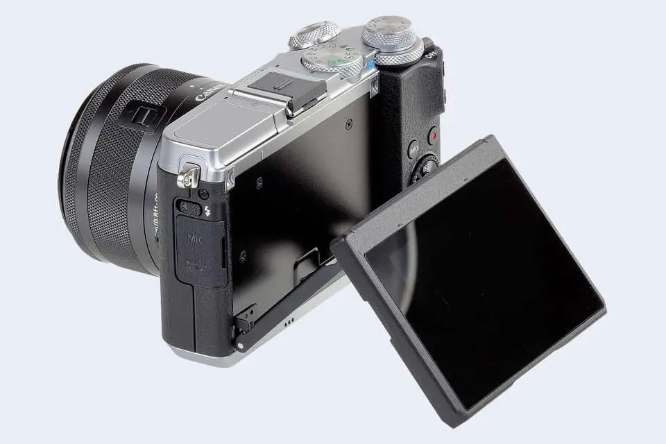 The LCD screen on the Canon EOS M6 is flexibly attached to the body. In particular, the LCD can be tilted vertically to facilitate odd-angle shots in landscape orientation. This tilting design is often preferred, for example, by street photographers to a fully articulated, swivel type of LCD attachment, as it is more unobtrusive during shooting than a screen that flips out to the side.