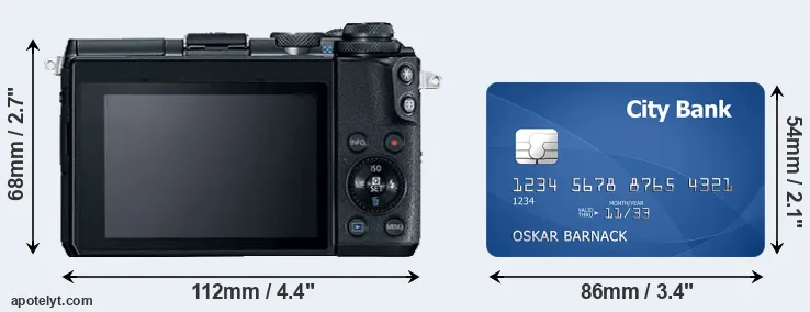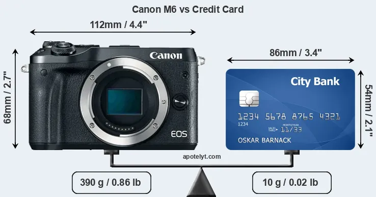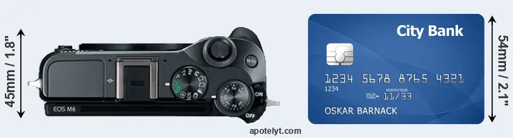 An illustration of the physical dimensions of the Canon M6 vis-à-vis a credit card is provided in the side-by-side display below. Three successive views from the front, the top, and the rear are shown. All width, height and depth dimensions are rounded to the nearest millimeter.