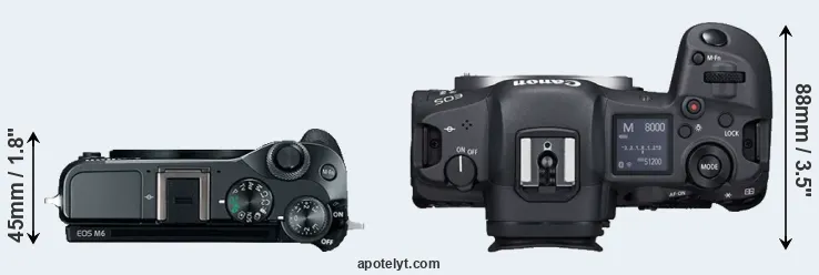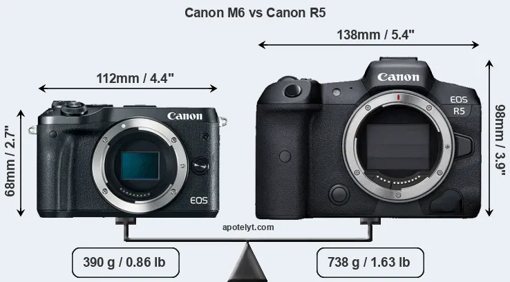 If the front view area (width x height) of the cameras is taken as an aggregate measure of their size, the Canon R5 is considerably larger (78 percent) than the Canon M6. Moreover, the R5 is substantially heavier (89 percent) than the M6. It is noteworthy in this context that the R5 is splash and dust-proof, while the M6 does not feature any corresponding weather-sealing.