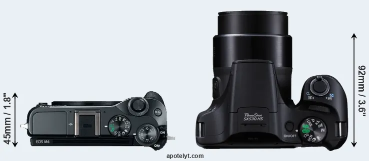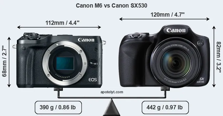 The side-by-side display below illustrates the physical size and weight of the Canon M6 and the Canon SX530. The two cameras are presented according to their relative size. Three consecutive perspectives from the front, the top, and the back are available. All width, height and depth dimensions are rounded to the nearest millimeter.