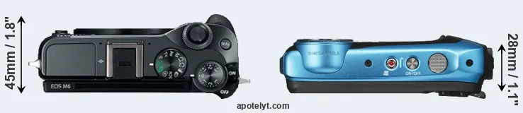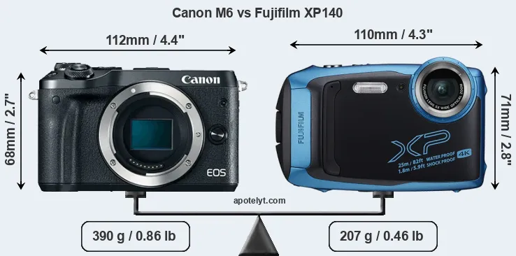 The side-by-side display below illustrates the physical size and weight of the Canon M6 and the Fujifilm XP140. The two cameras are presented according to their relative size. Three consecutive perspectives from the front, the top, and the back are available. All width, height and depth dimensions are rounded to the nearest millimeter.