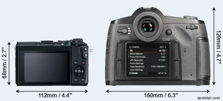 The physical size and weight of the Canon M6 and the Leica S-E Typ 006 are illustrated in the side-by-side display below. The two cameras are presented according to their relative size. Three consecutive views from the front, the top, and the rear side are shown. All width, height and depth dimensions are rounded to the nearest millimeter.