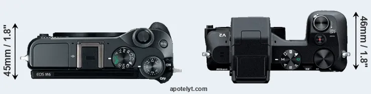 The side-by-side display below illustrates the physical size and weight of the Canon M6 and the Nikon 1 V2. The two cameras are presented according to their relative size. Three consecutive perspectives from the front, the top, and the back are available. All width, height and depth dimensions are rounded to the nearest millimeter.