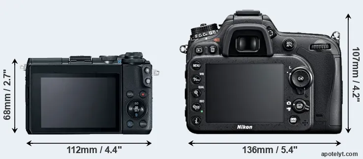 The side-by-side display below illustrates the physical size and weight of the Canon M6 and the Nikon D7100. The two cameras are presented according to their relative size. Three consecutive views from the front, the top, and the rear side are shown. All width, height and depth dimensions are rounded to the nearest millimeter.