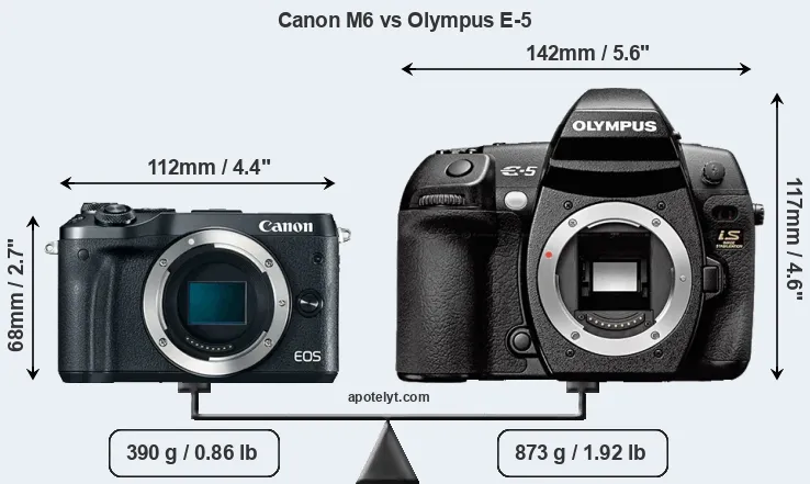 If the front view area (width x height) of the cameras is taken as an aggregate measure of their size, the Olympus E-5 is considerably larger (118 percent) than the Canon M6. Moreover, the E-5 is substantially heavier (124 percent) than the M6. It is noteworthy in this context that the E-5 is splash and dust-proof, while the M6 does not feature any corresponding weather-sealing.