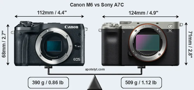 An illustration of the physical size and weight of the Canon M6 and the Sony A7C is provided in the side-by-side display below. The two cameras are presented according to their relative size. Three consecutive perspectives from the front, the top, and the back are available. All width, height and depth measures are rounded to the nearest millimeter.