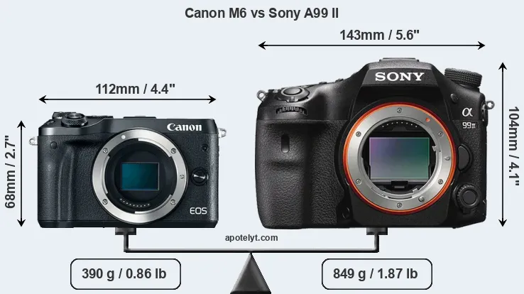 If the front view area (width x height) of the cameras is taken as an aggregate measure of their size, the Sony A99 II is considerably larger (95 percent) than the Canon M6. Moreover, the A99 II is substantially heavier (118 percent) than the M6. It is noteworthy in this context that the A99 II is splash and dust-proof, while the M6 does not feature any corresponding weather-sealing.