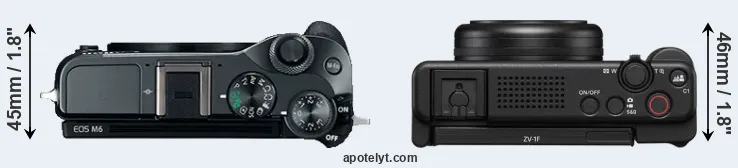 An illustration of the physical size and weight of the Canon M6 and the Sony ZV-1F is provided in the side-by-side display below. The two cameras are presented according to their relative size. Three consecutive perspectives from the front, the top, and the back are available. All width, height and depth measures are rounded to the nearest millimeter.