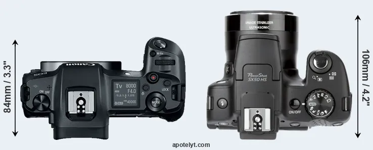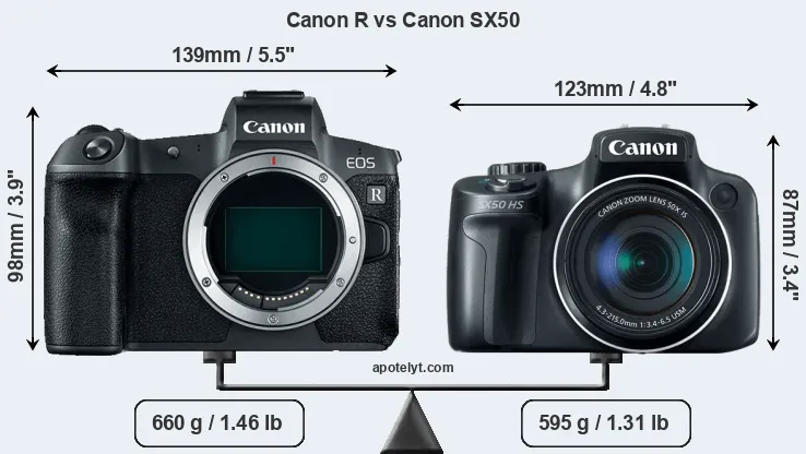 An illustration of the physical size and weight of the Canon R and the Canon SX50 is provided in the side-by-side display below. The two cameras are presented according to their relative size. Three consecutive views from the front, the top, and the rear side are shown. All size dimensions are rounded to the nearest millimeter.