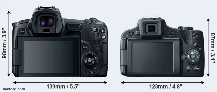 The above size and weight comparisons are to some extent incomplete and possibly misleading, as the SX50 has a lens built in, whereas the Canon R is an interchangeable lens camera that requires a separate lens. Attaching the latter will add extra weight and bulk to the setup.
