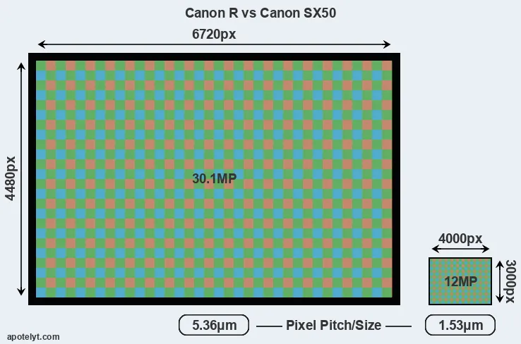 With 30.1MP, the Canon R offers a higher resolution than the SX50 (12MP), but the Canon R nevertheless has larger individual pixels (pixel pitch of 5.36μm versus 1.53μm for the SX50) due to its larger sensor. Moreover, the Canon R is a much more recent model (by 5 years and 11 months) than the SX50, and its sensor will have benefitted from technological advances during this time that further enhance the light gathering capacity of its pixels.