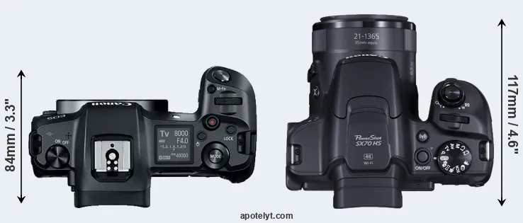 The physical size and weight of the Canon R and the Canon SX70 are illustrated in the side-by-side display below. The two cameras are presented according to their relative size. Three successive views from the front, the top, and the rear are shown. All width, height and depth measures are rounded to the nearest millimeter.