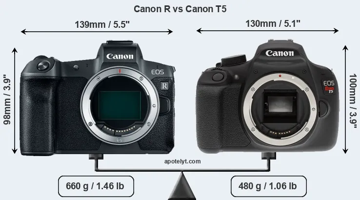 The side-by-side display below illustrates the physical size and weight of the Canon R and the Canon T5. The two cameras are presented according to their relative size. Three consecutive perspectives from the front, the top, and the back are available. All size dimensions are rounded to the nearest millimeter.