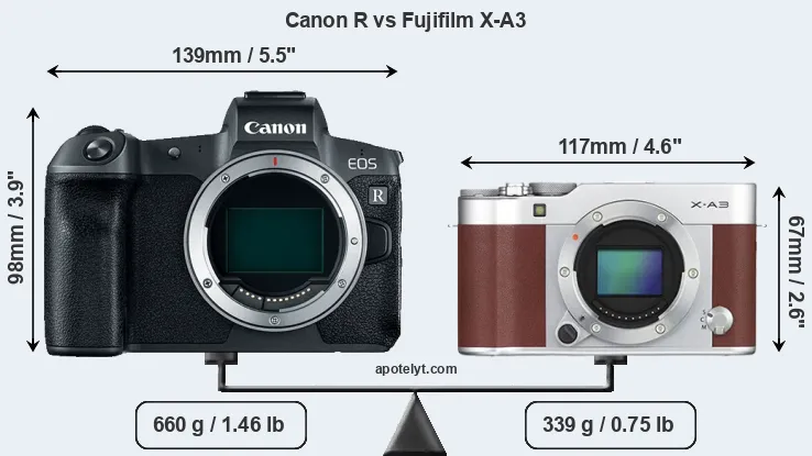 An illustration of the physical size and weight of the Canon R and the Fujifilm X-A3 is provided in the side-by-side display below. The two cameras are presented according to their relative size. Three consecutive perspectives from the front, the top, and the back are available. All size dimensions are rounded to the nearest millimeter.