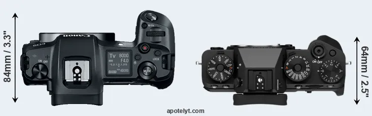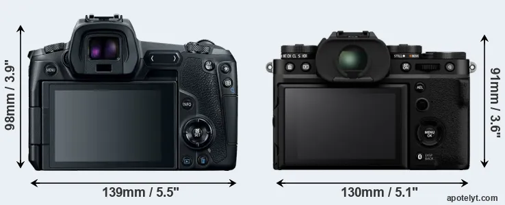 The physical size and weight of the Canon R and the Fujifilm X-T5 are illustrated in the side-by-side display below. The two cameras are presented according to their relative size. Three consecutive perspectives from the front, the top, and the back are available. All width, height and depth dimensions are rounded to the nearest millimeter.