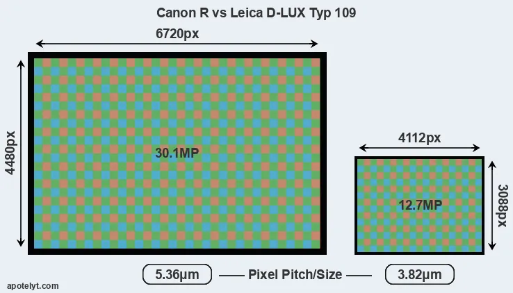 With 30.1MP, the Canon R offers a higher resolution than the D-LUX Typ 109 (12.7MP), but the Canon R nevertheless has larger individual pixels (pixel pitch of 5.36μm versus 3.82μm for the D-LUX Typ 109) due to its larger sensor. Moreover, the Canon R is a much more recent model (by 3 years and 11 months) than the D-LUX Typ 109, and its sensor will have benefitted from technological advances during this time that further enhance the light gathering capacity of its pixels.
