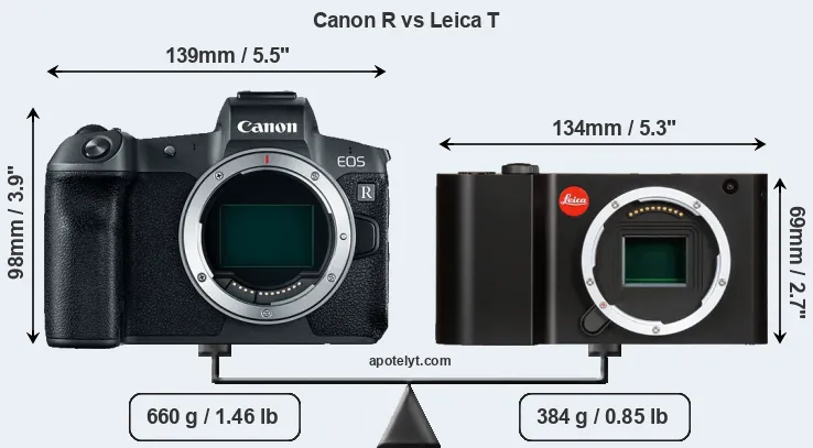 The side-by-side display below illustrates the physical size and weight of the Canon R and the Leica T. The two cameras are presented according to their relative size. Three consecutive perspectives from the front, the top, and the back are available. All width, height and depth dimensions are rounded to the nearest millimeter.