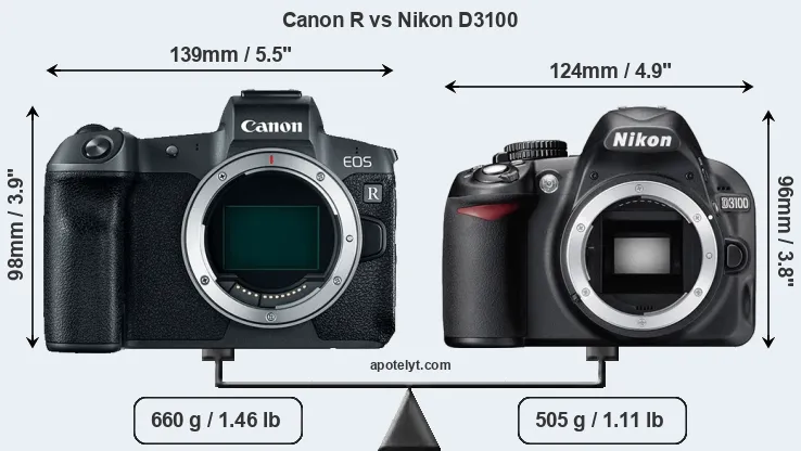 The side-by-side display below illustrates the physical size and weight of the Canon R and the Nikon D3100. The two cameras are presented according to their relative size. Three consecutive views from the front, the top, and the rear side are shown. All size dimensions are rounded to the nearest millimeter.
