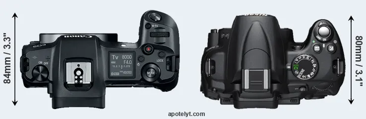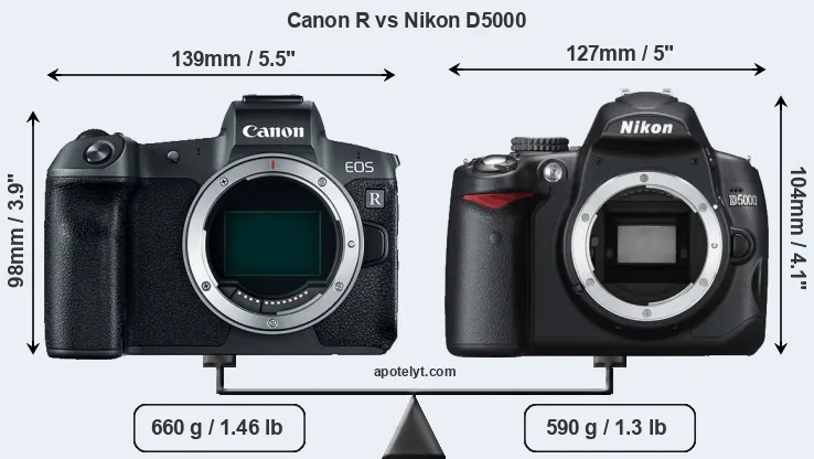 An illustration of the physical size and weight of the Canon R and the Nikon D5000 is provided in the side-by-side display below. The two cameras are presented according to their relative size. Three consecutive perspectives from the front, the top, and the back are available. All width, height and depth dimensions are rounded to the nearest millimeter.