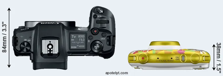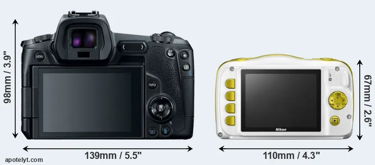 An illustration of the physical size and weight of the Canon R and the Nikon W150 is provided in the side-by-side display below. The two cameras are presented according to their relative size. Three successive views from the front, the top, and the rear are shown. All width, height and depth dimensions are rounded to the nearest millimeter.