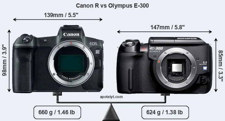 An illustration of the physical size and weight of the Canon R and the Olympus E-300 is provided in the side-by-side display below. The two cameras are presented according to their relative size. Three consecutive views from the front, the top, and the rear side are shown. All width, height and depth measures are rounded to the nearest millimeter.