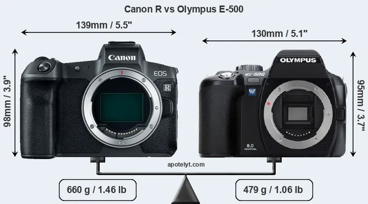 If the front view area (width x height) of the cameras is taken as an aggregate measure of their size, the Olympus E-500 is notably smaller (9 percent) than the Canon R. Moreover, the E-500 is markedly lighter (27 percent) than the Canon R. It is worth mentioning in this context that the Canon R is splash and dust resistant, while the E-500 does not feature any corresponding weather-sealing.