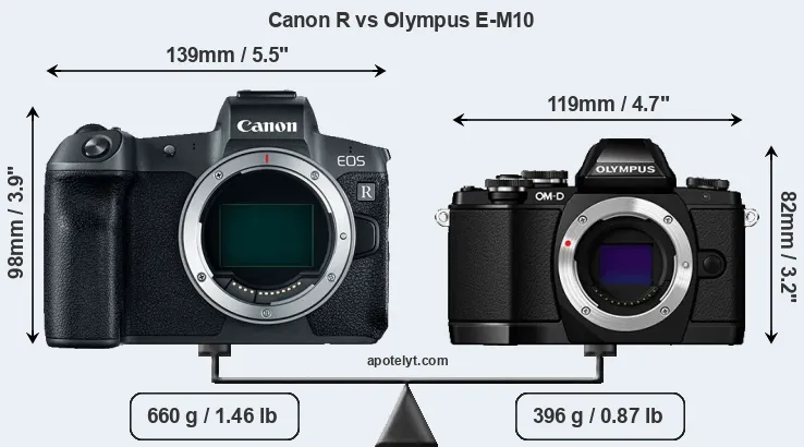 If the front view area (width x height) of the cameras is taken as an aggregate measure of their size, the Olympus E-M10 is notably smaller (28 percent) than the Canon R. Moreover, the E-M10 is substantially lighter (40 percent) than the Canon R. It is worth mentioning in this context that the Canon R is splash and dust resistant, while the E-M10 does not feature any corresponding weather-sealing.
