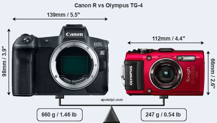 The above size and weight comparisons are to some extent incomplete and possibly misleading, as the TG-4 has a lens built in, whereas the Canon R is an interchangeable lens camera that requires a separate lens. Attaching the latter will add extra weight and bulk to the setup.