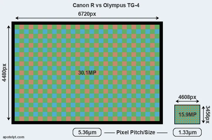 With 30.1MP, the Canon R offers a higher resolution than the TG-4 (15.9MP), but the Canon R nevertheless has larger individual pixels (pixel pitch of 5.36μm versus 1.33μm for the TG-4) due to its larger sensor. Moreover, the Canon R is a much more recent model (by 3 years and 4 months) than the TG-4, and its sensor will have benefitted from technological advances during this time that further enhance the light gathering capacity of its pixels.