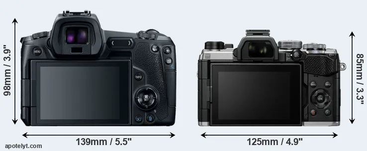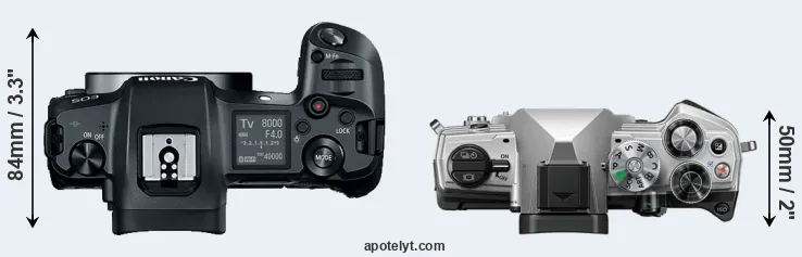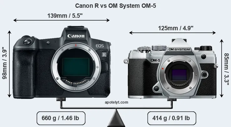 An illustration of the physical size and weight of the Canon R and the OM System OM-5 is provided in the side-by-side display below. The two cameras are presented according to their relative size. Three consecutive perspectives from the front, the top, and the back are available. All size dimensions are rounded to the nearest millimeter.