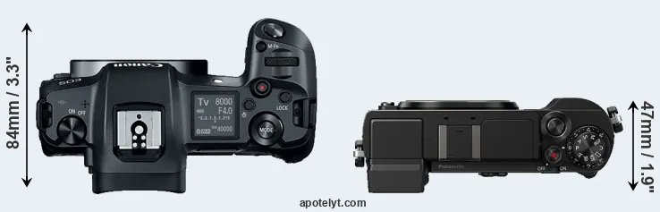 The side-by-side display below illustrates the physical size and weight of the Canon R and the Panasonic GX9. The two cameras are presented according to their relative size. Three consecutive perspectives from the front, the top, and the back are available. All width, height and depth measures are rounded to the nearest millimeter.
