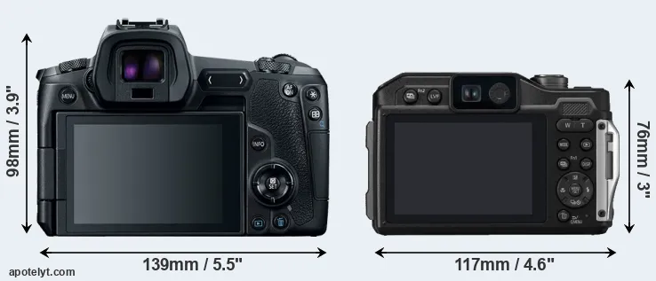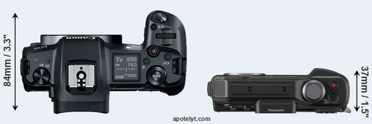 The physical size and weight of the Canon R and the Panasonic TS7 are illustrated in the side-by-side display below. The two cameras are presented according to their relative size. Three consecutive views from the front, the top, and the rear side are shown. All size dimensions are rounded to the nearest millimeter.